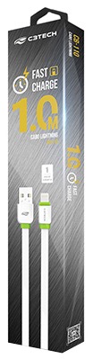 - Cabo Lightning C3Tech CB-110 branco Fast Charge, desenvolvido para recarga rápida de aparelhos com sistema iOS.